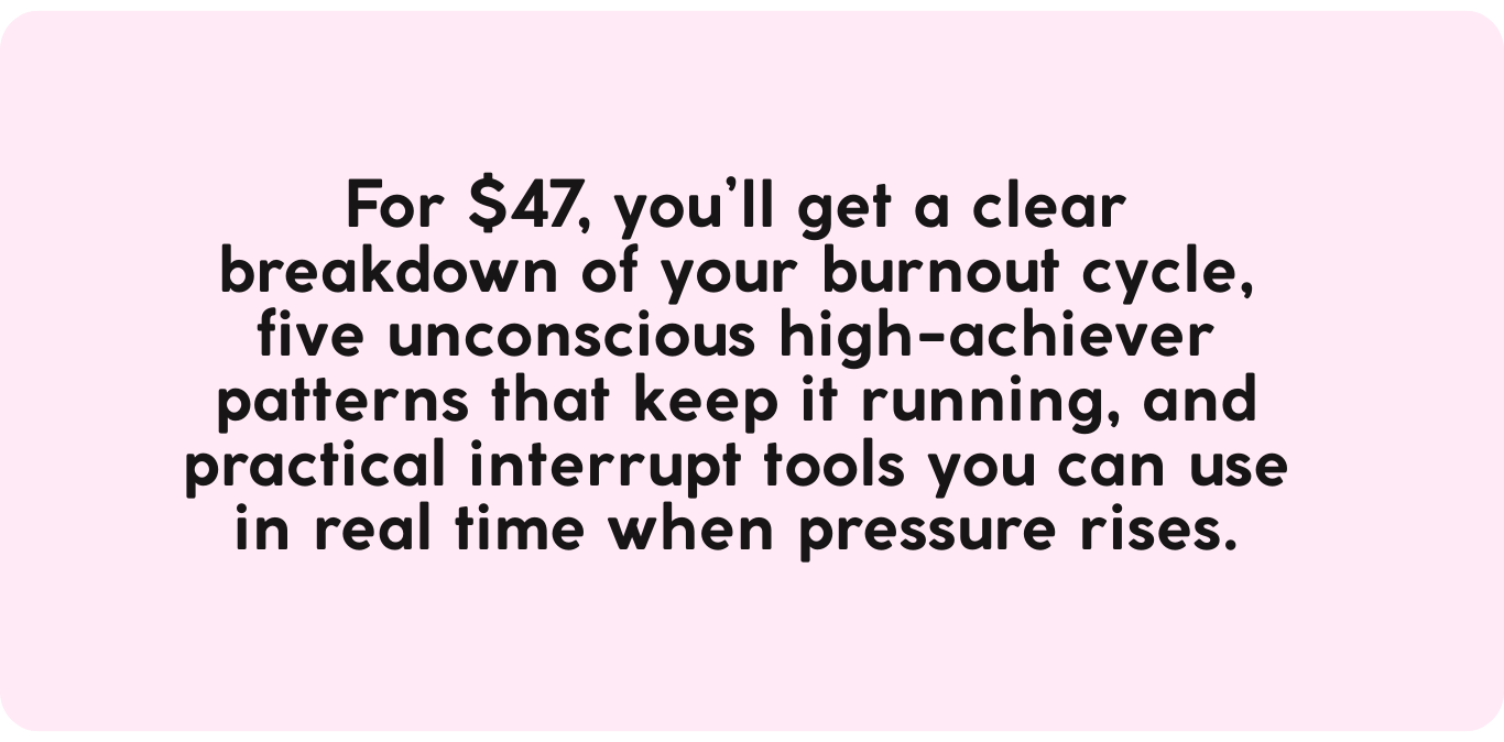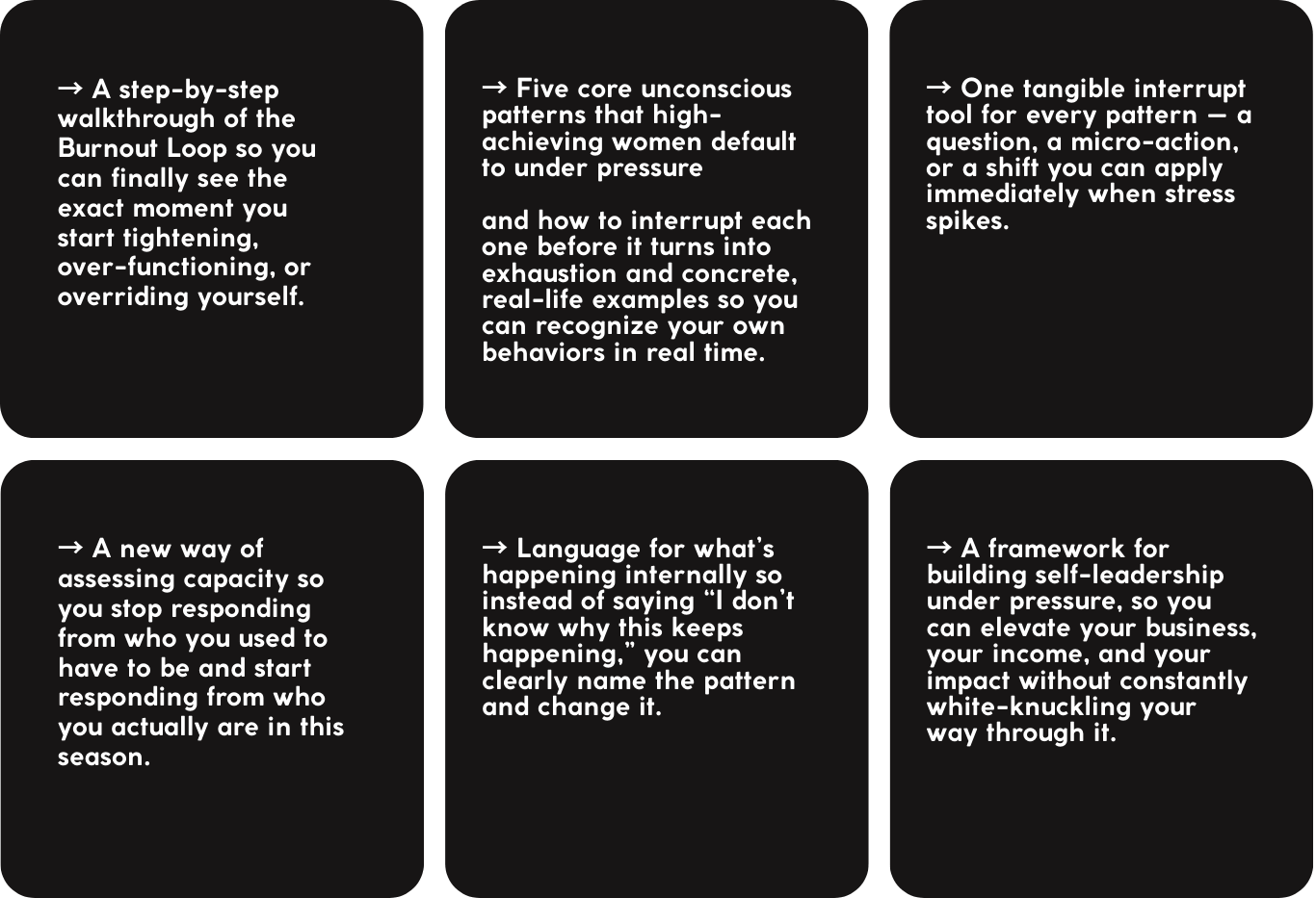 Most women inside this work have. The difference here isnât another tactic, itâs awareness. You may have tried âdoing the right things,â but if the underlying pattern hasnât shifted, burnout keeps repeating. This course helps you see whatâs actually driving the cycle.